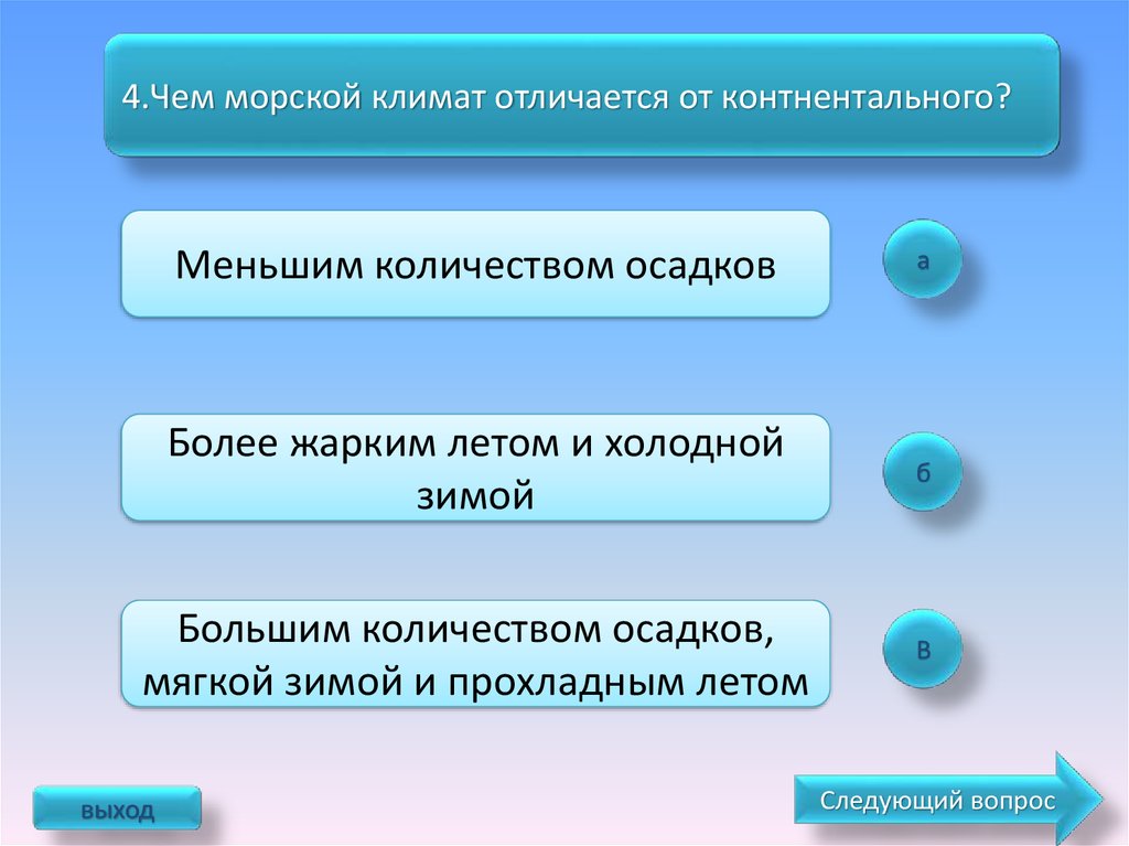 4.Чем морской климат отличается от контнентального?Меньшим количеством осадков