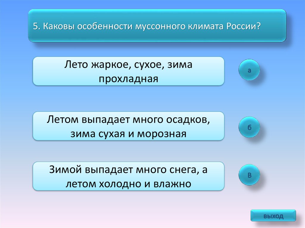 5. Каковы особенности муссонного климата России?Лето жаркое, сухое, зима