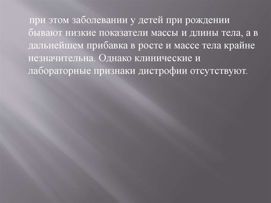 при этом заболевании у детей при рождениибывают низкие показатели массы и длины тела, а в