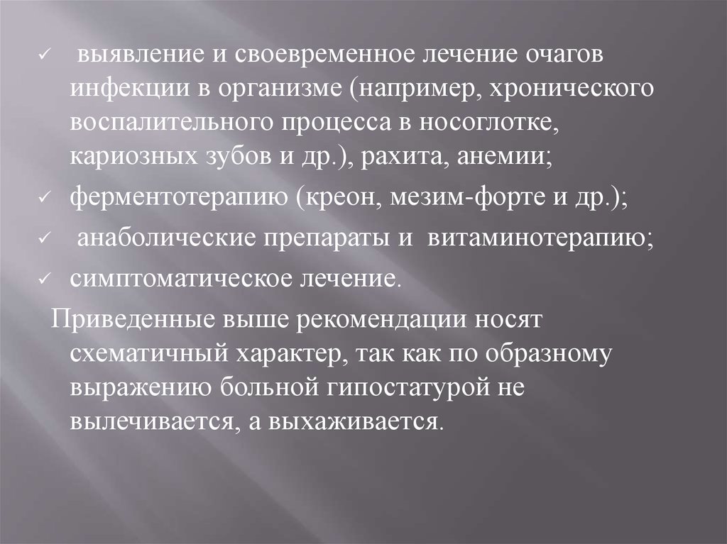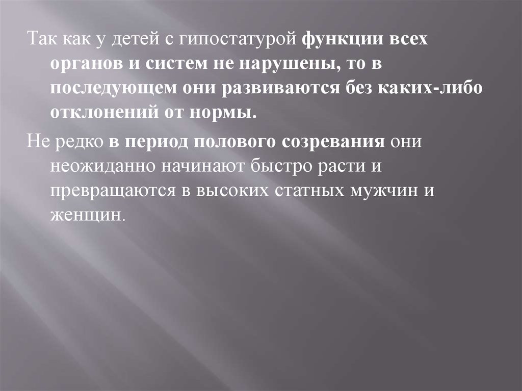 Так как у детей с гипостатурой функции всехорганов и систем не нарушены, то в
