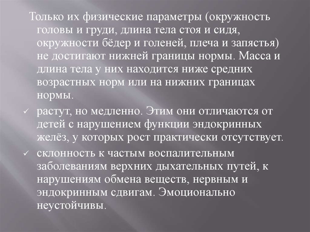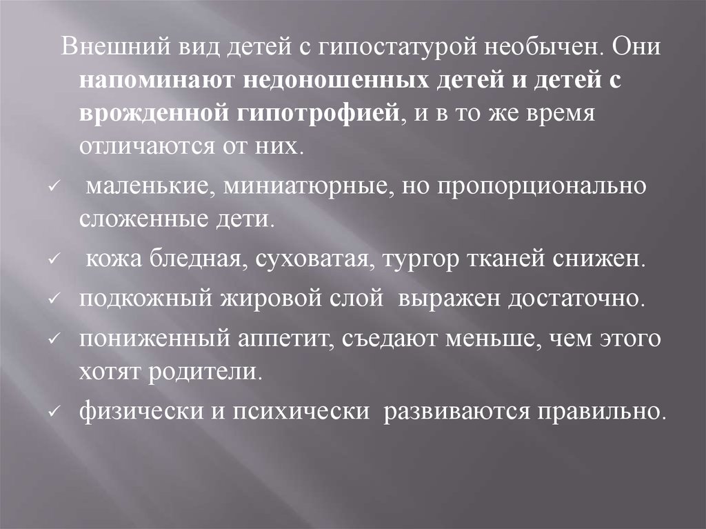 Внешний вид детей с гипостатурой необычен. Онинапоминают недоношенных детей и детей с