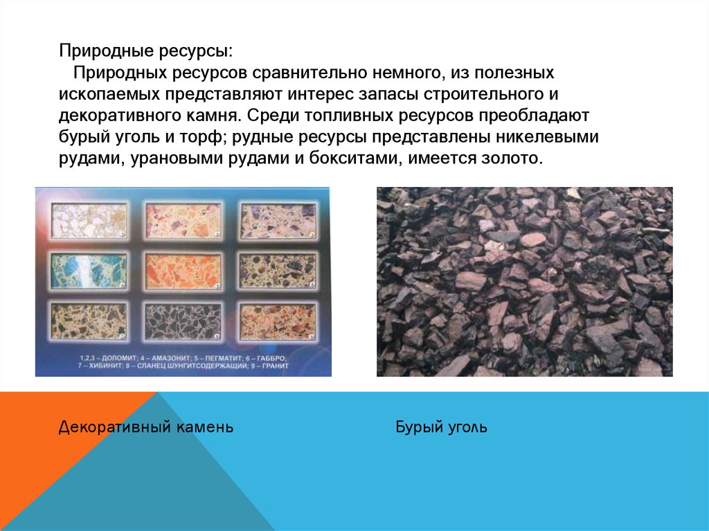 бурый уголь и торф; рудные ресурсы представлены никелевыми