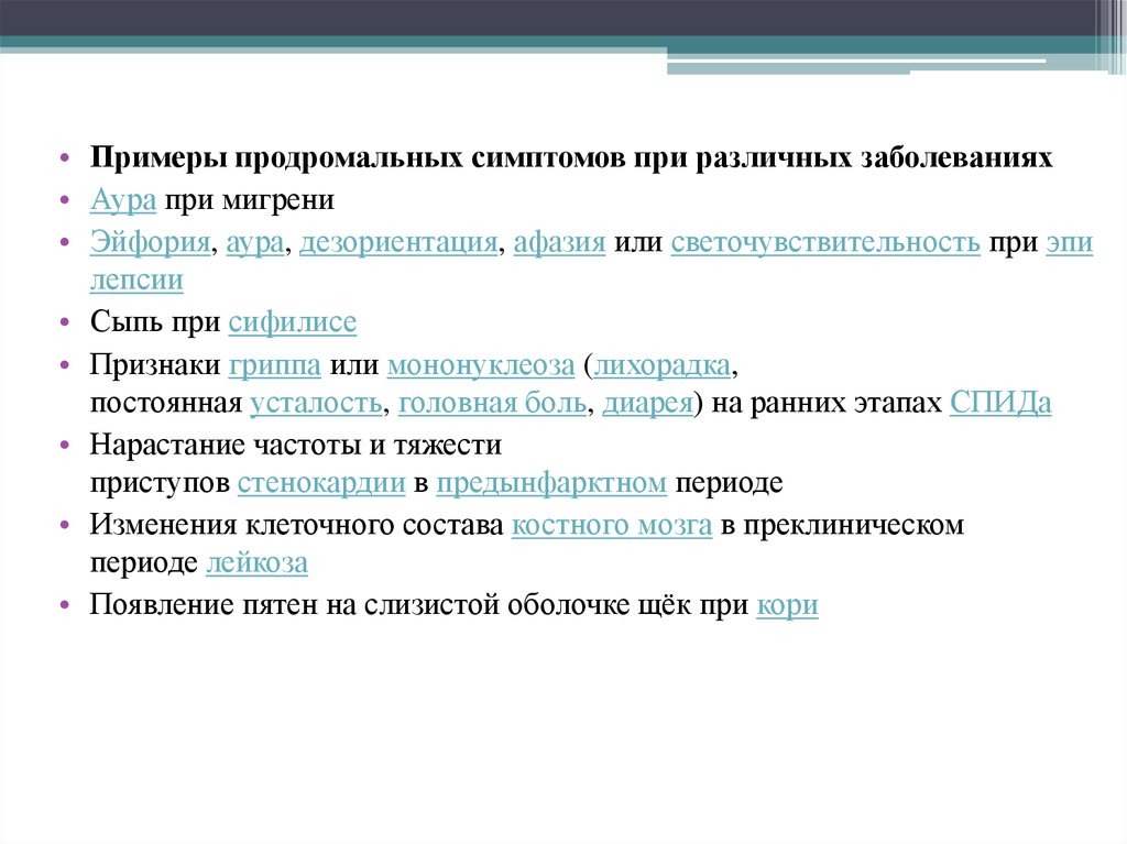 • Примеры продромальных симптомов при различных заболеваниях• Аура при мигрени