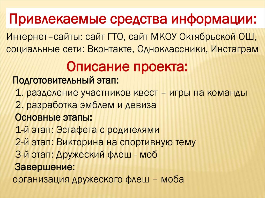 Привлекаемые средства информации:Интернет–сайты: сайт ГТО, сайт МКОУ Октябрьской ОШ,