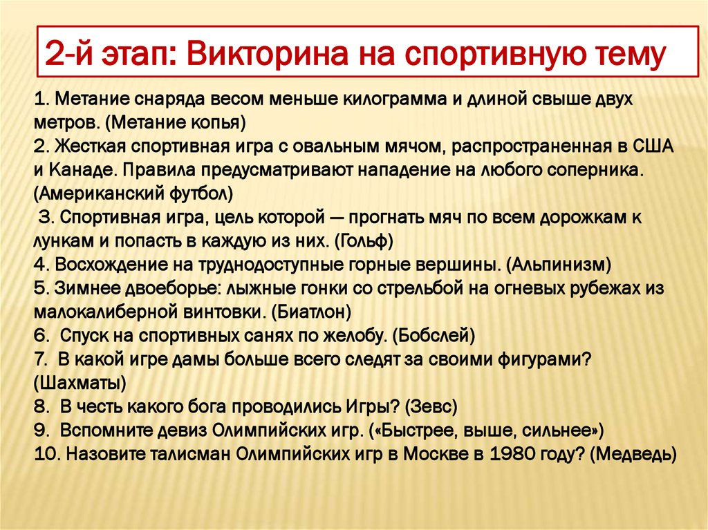 2-й этап: Викторина на спортивную тему1. Метание снаряда весом меньше килограмма и длиной свыше двух