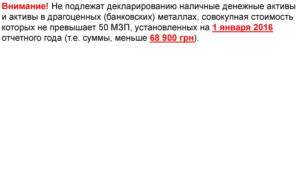 Внимание! Не подлежат декларированию наличные денежные активыи активы в драгоценных (банковских) металлах, совокупная стоимость