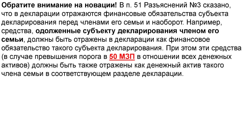 Обратите внимание на новации! В п. 51 Разъяснений №3 сказано,что в декларации отражаются финансовые обязательства субъекта