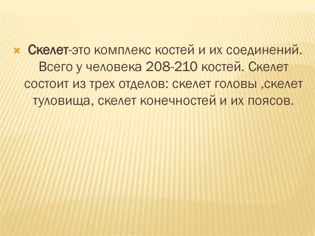 Скелет-это комплекс костей и их соединений.Всего у человека 208-210 костей. Скелет