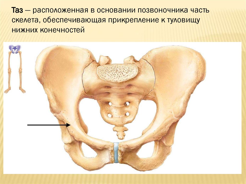 Таз — расположенная в основании позвоночника частьскелета, обеспечивающая прикрепление к туловищу