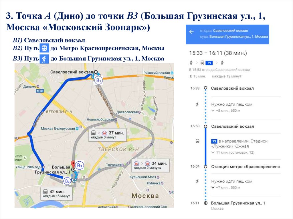 3. Точка А (Дино) до точки В3 (Большая Грузинская ул., 1,Москва «Московский Зоопарк»)
