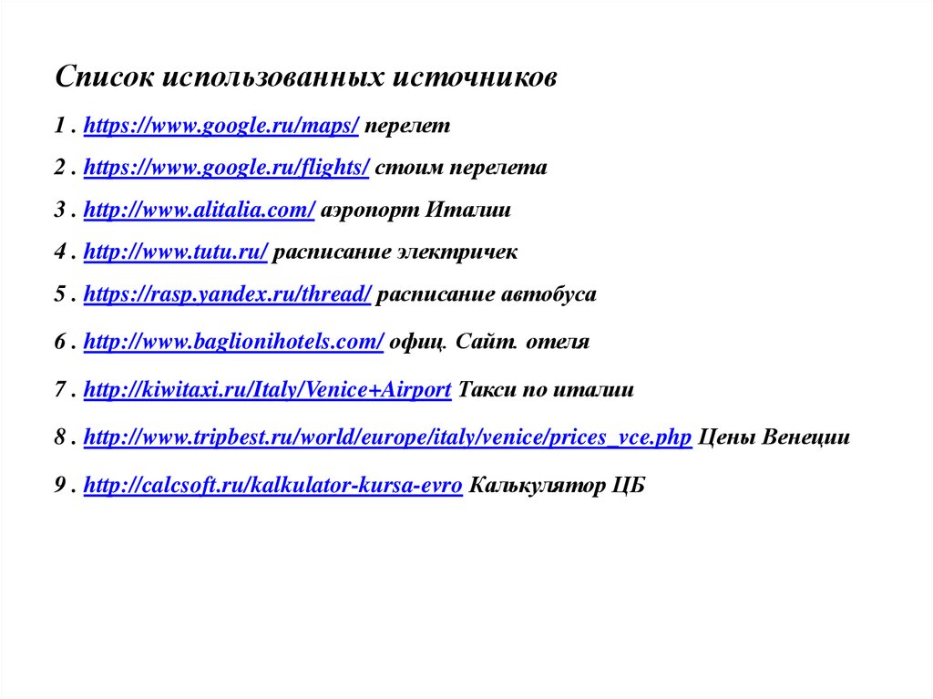 Список использованных источников1 . https://www.google.ru/maps/ перелет