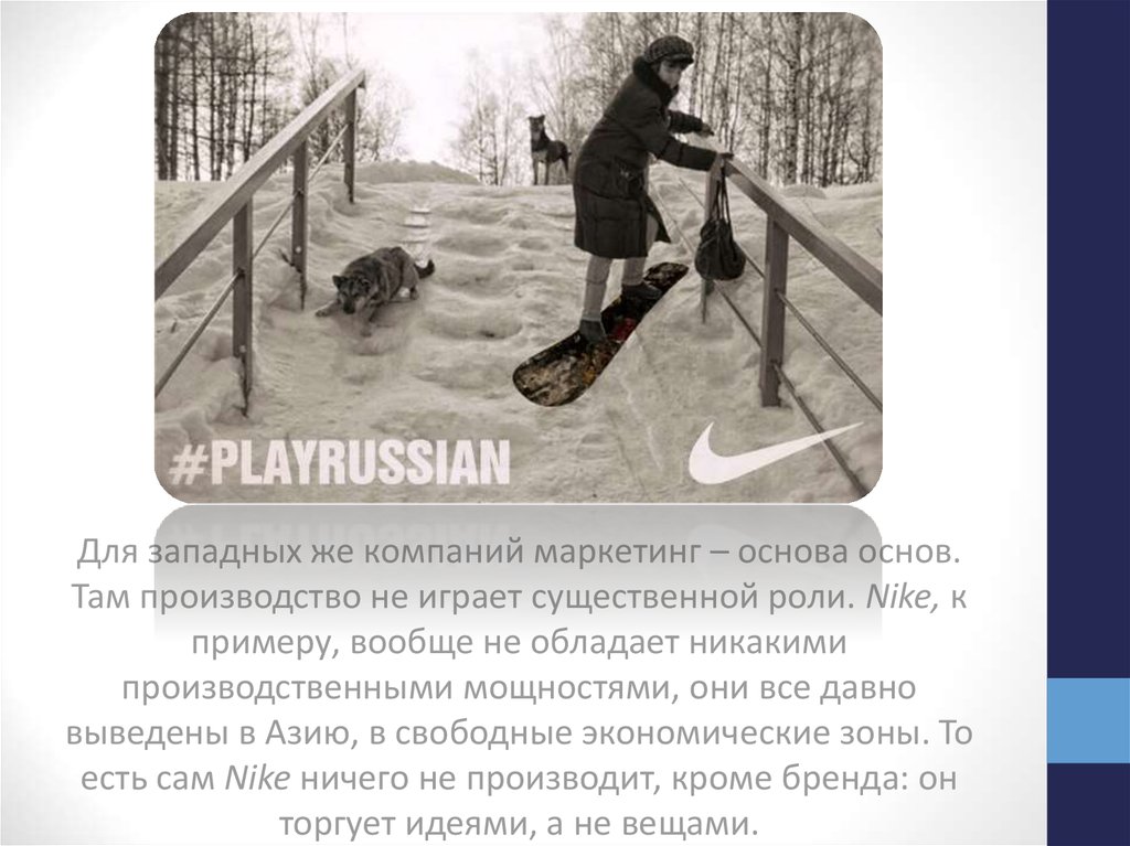 Для западных же компаний маркетинг – основа основ.Там производство не играет существенной роли. Nike, к