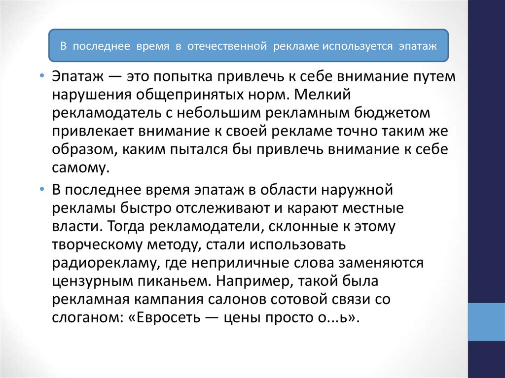 В последнее время в отечественной рекламе используется эпатаж• Эпатаж — это попытка привлечь к себе внимание путем