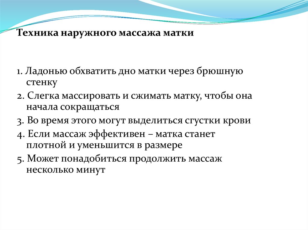 1) Тонус - нарушение тонуса матки (атония матки):а) наружный массаж матки