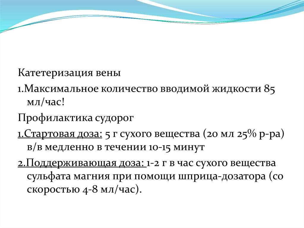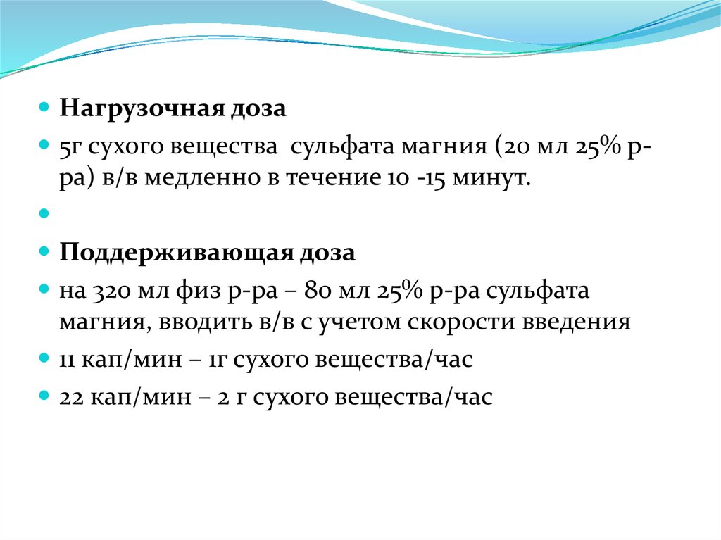 Нагрузочная доза5г сухого вещества сульфата магния (20 мл 25% р-