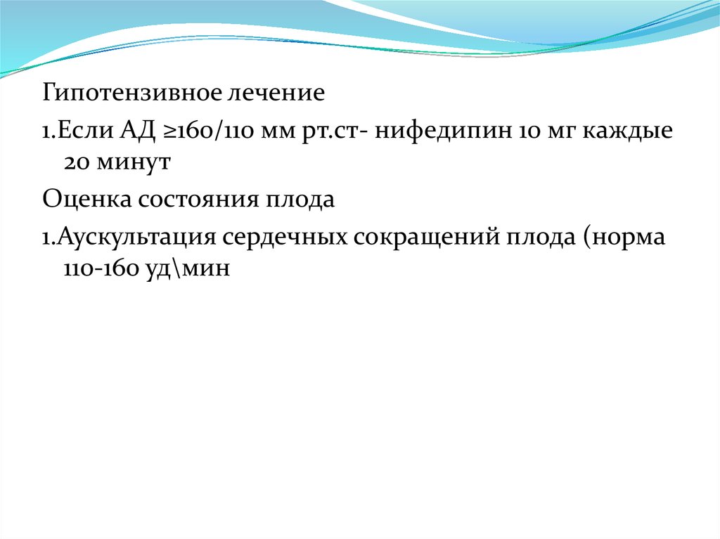 Гипотензивное лечение1.Если АД ≥160/110 мм рт.ст- нифедипин 10 мг каждые