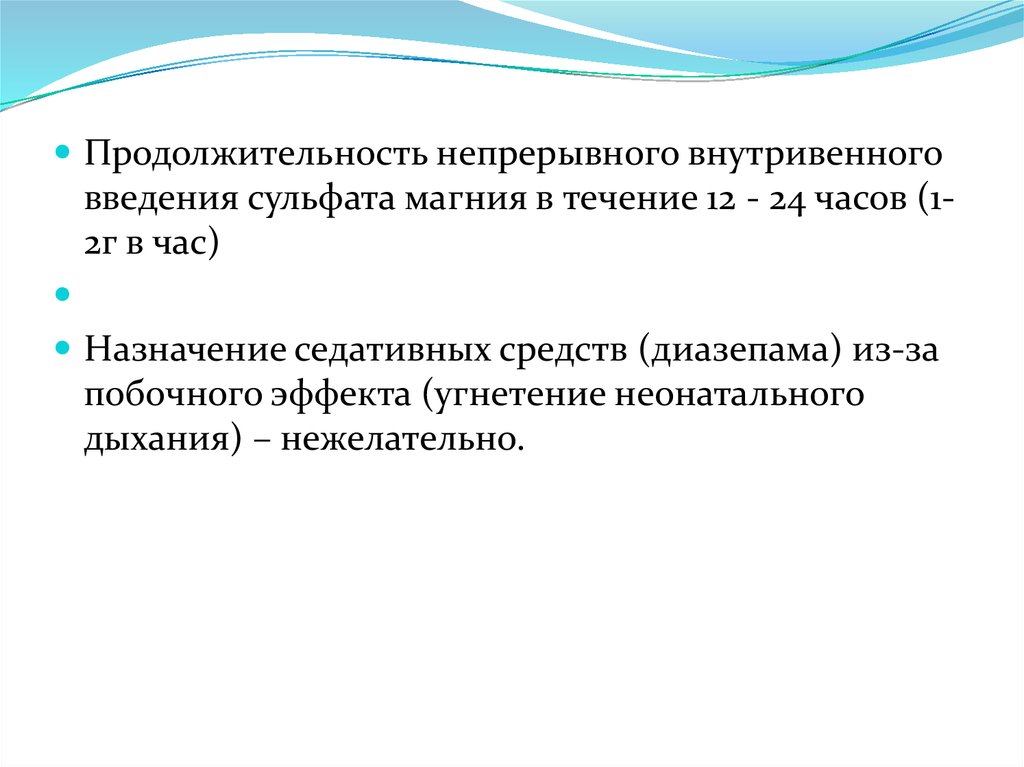 Продолжительность непрерывного внутривенноговведения сульфата магния в течение 12 - 24 часов (12г в час)
