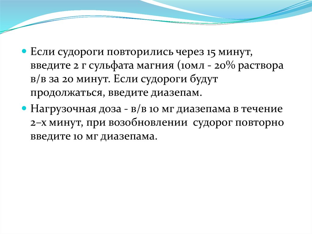 Если судороги повторились через 15 минут,введите 2 г сульфата магния (10мл - 20% раствора