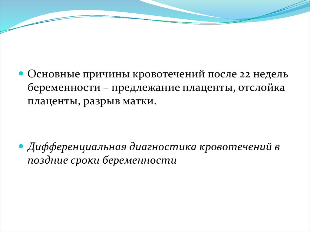 Основные причины кровотечений после 22 недельбеременности – предлежание плаценты, отслойка