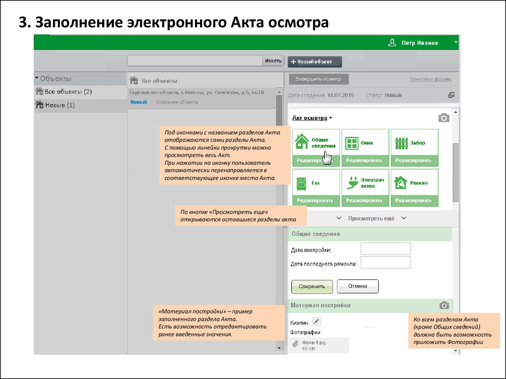 3. Заполнение электронного Акта осмотраПод иконками с названием разделов Акта