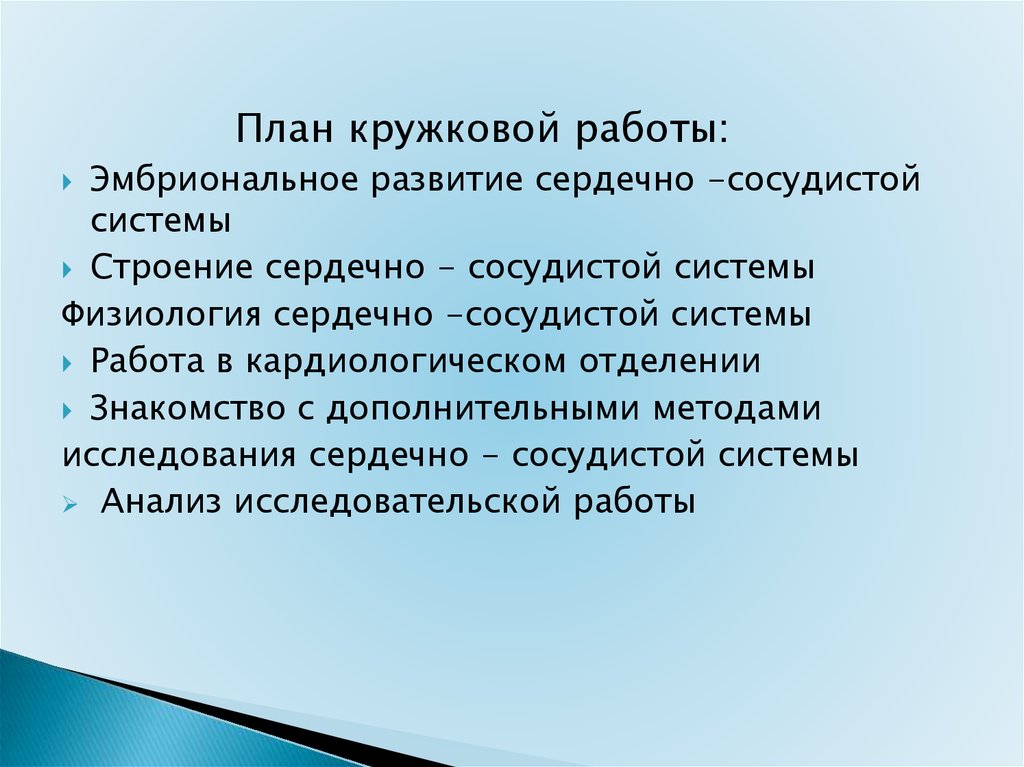 План кружковой работы:Эмбриональное развитие сердечно -сосудистой