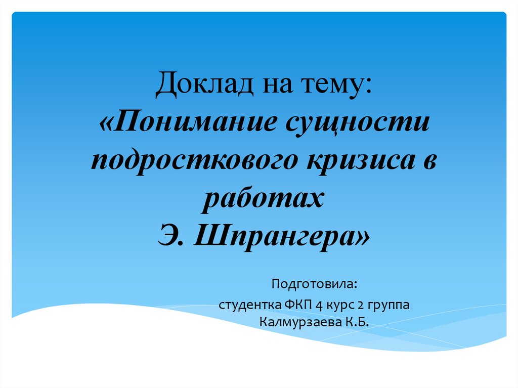 1. Доклад на тему: «Понимание сущности подросткового кризиса в работах Э. Шпрангера»