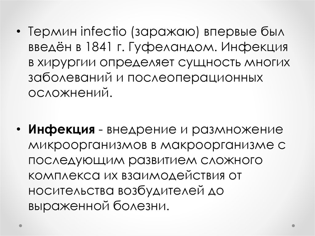 • Термин infectio (заражаю) впервые былвведён в 1841 г. Гуфеландом. Инфекция