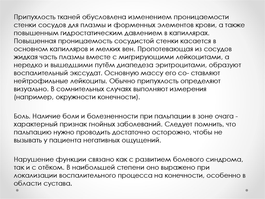 Припухлость тканей обусловлена изменением проницаемостистенки сосудов для плазмы и форменных элементов крови, а также