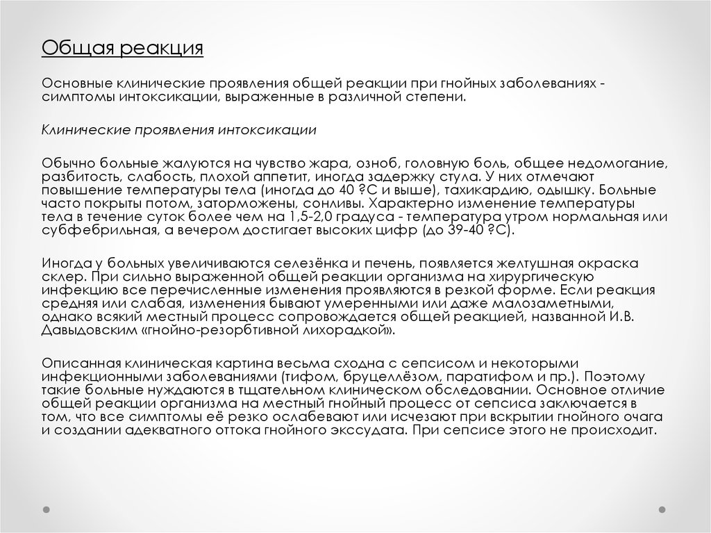 Общая реакцияОсновные клинические проявления общей реакции при гнойных заболеваниях симптомы интоксикации, выраженные в различной степени.