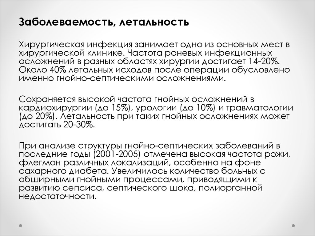 Заболеваемость, летальностьХирургическая инфекция занимает одно из основных мест в