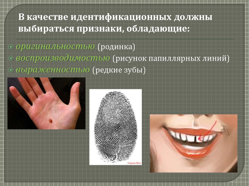 В качестве идентификационных должнывыбираться признаки, обладающие: