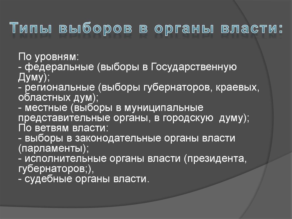 По уровням:- федеральные (выборы в Государственную