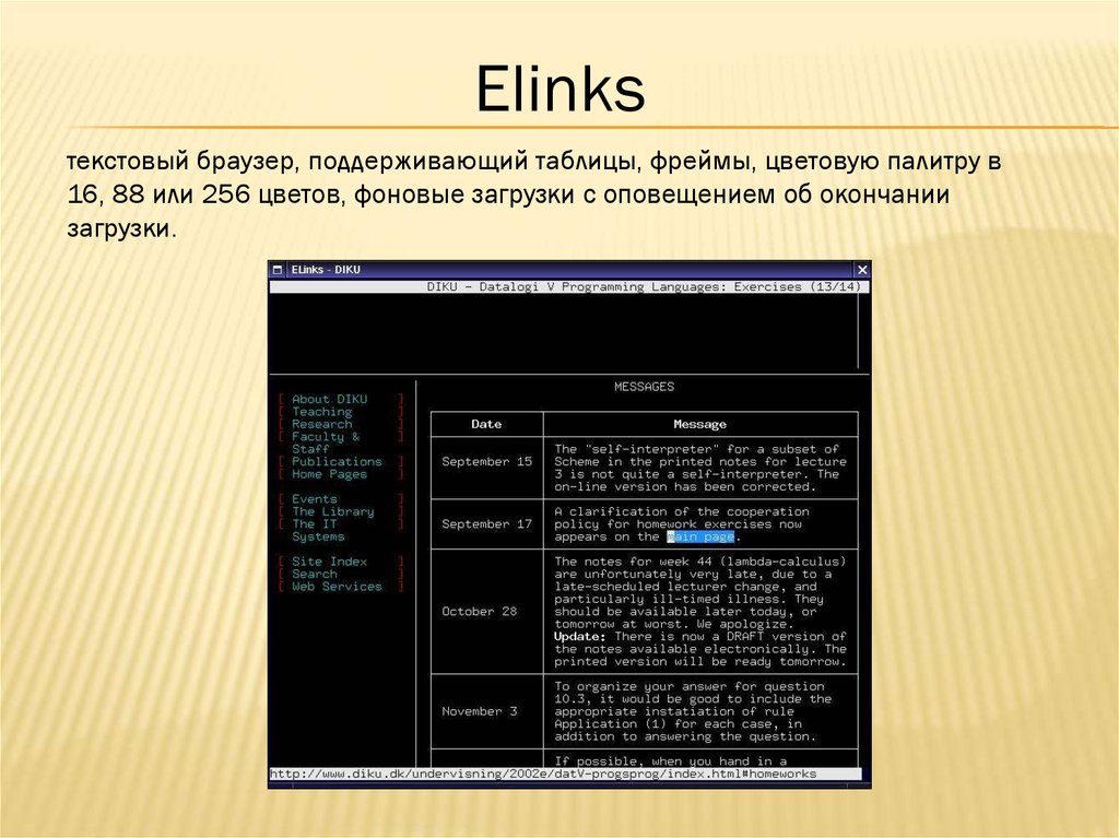 Elinksтекстовый браузер, поддерживающий таблицы, фреймы, цветовую палитру в