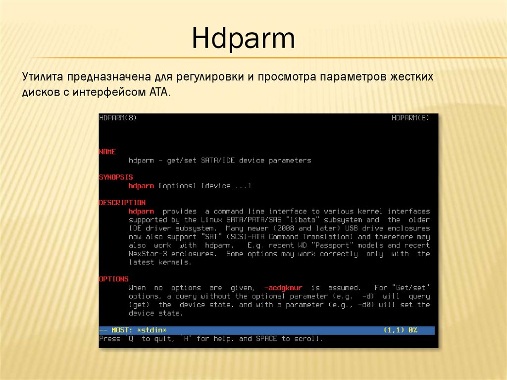 HdparmУтилита предназначена для регулировки и просмотра параметров жестких