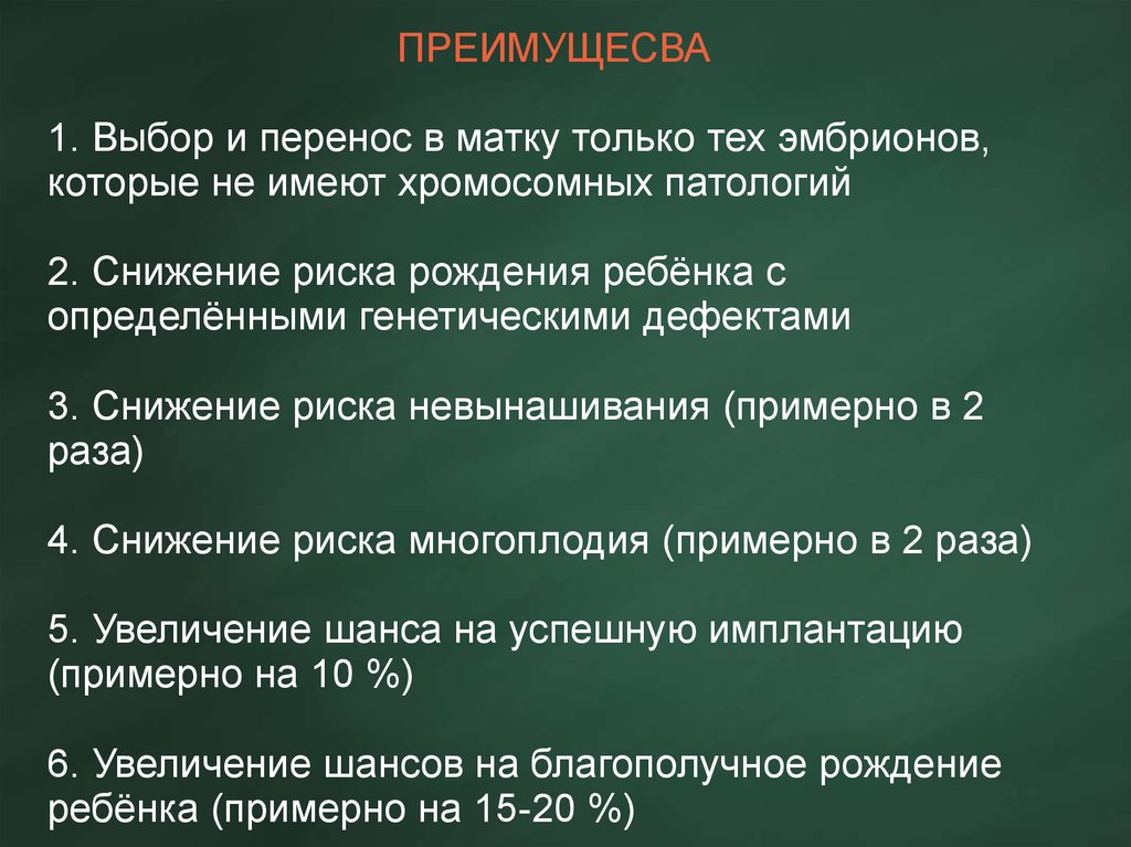 ПРЕИМУЩЕСВА1. Выбор и перенос в матку только тех эмбрионов,