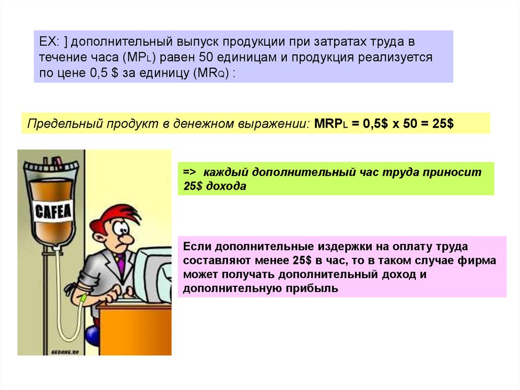 ЕХ: ] дополнительный выпуск продукции при затратах труда втечение часа (МРL) равен 50 единицам и продукция реализуется