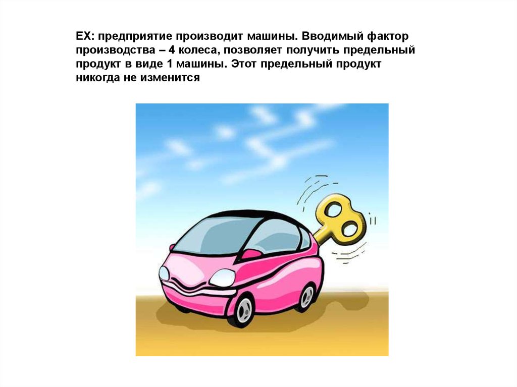ЕХ: предприятие производит машины. Вводимый факторпроизводства – 4 колеса, позволяет получить предельный