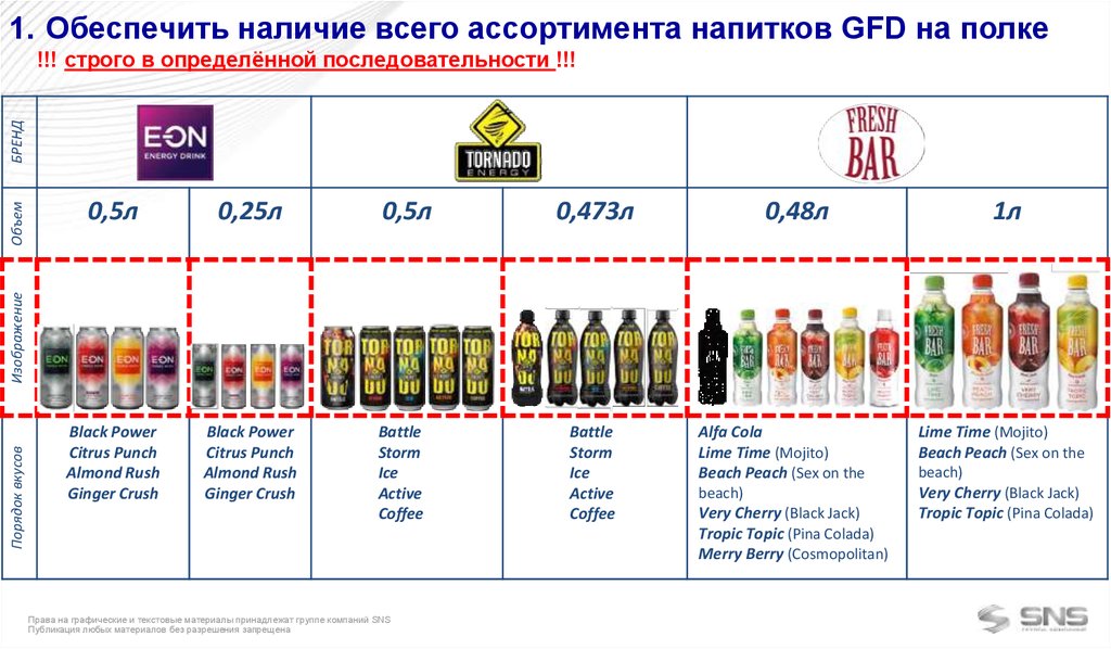 1. Обеспечить наличие всего ассортимента напитков GFD на полке0,5л