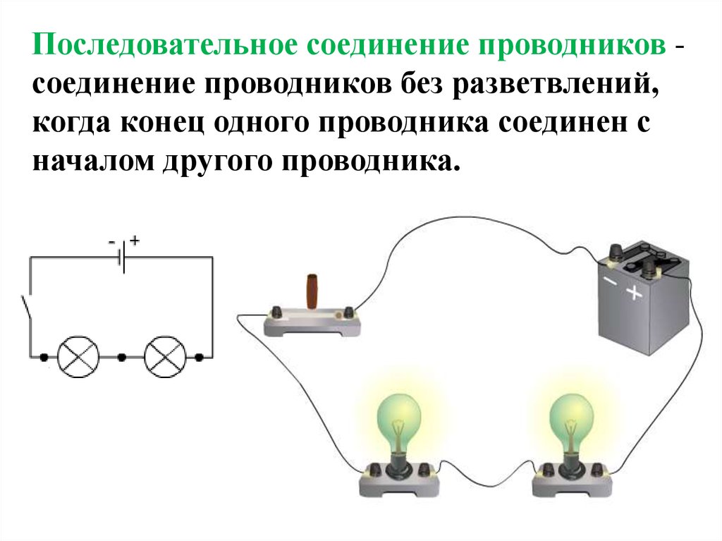 Последовательное соединение проводников соединение проводников без разветвлений,когда конец одного проводника соединен с