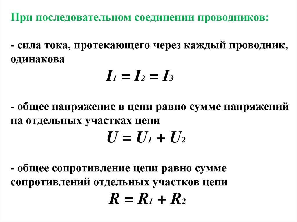 При последовательном соединении проводников:- сила тока, протекающего через каждый проводник,