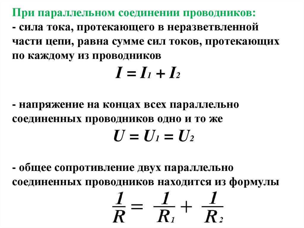 При параллельном соединении проводников:- сила тока, протекающего в неразветвленной