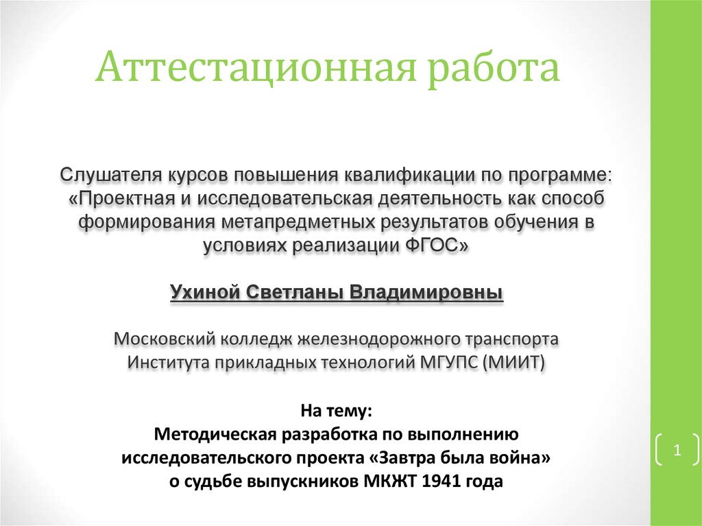 Аттестационная работа. Исследовательский проект «Завтра была война» о судьбе выпускников МКЖТ 1941 года