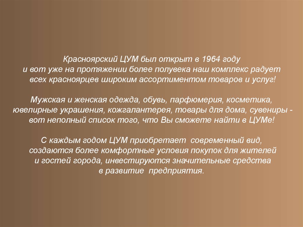 ювелирные украшения, кожгалантерея, товары для дома, сувениры вот неполный список того, что Вы сможете найти в ЦУМе!