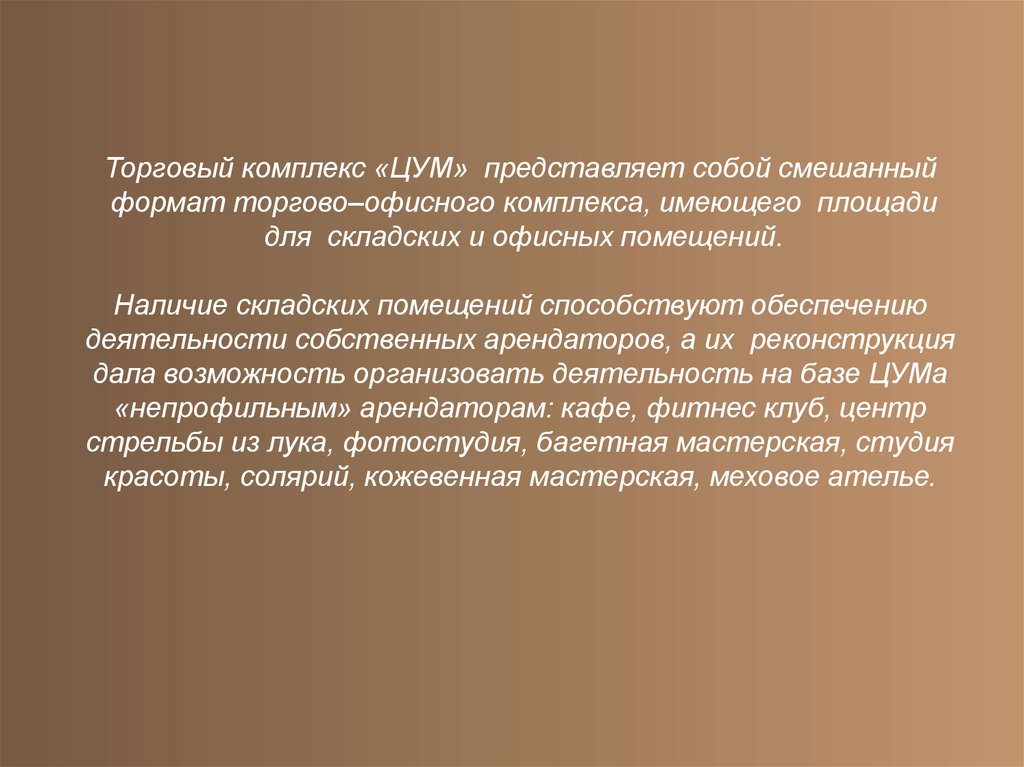 Торговый комплекс «ЦУМ» представляет собой смешанныйформат торгово–офисного комплекса, имеющего площади