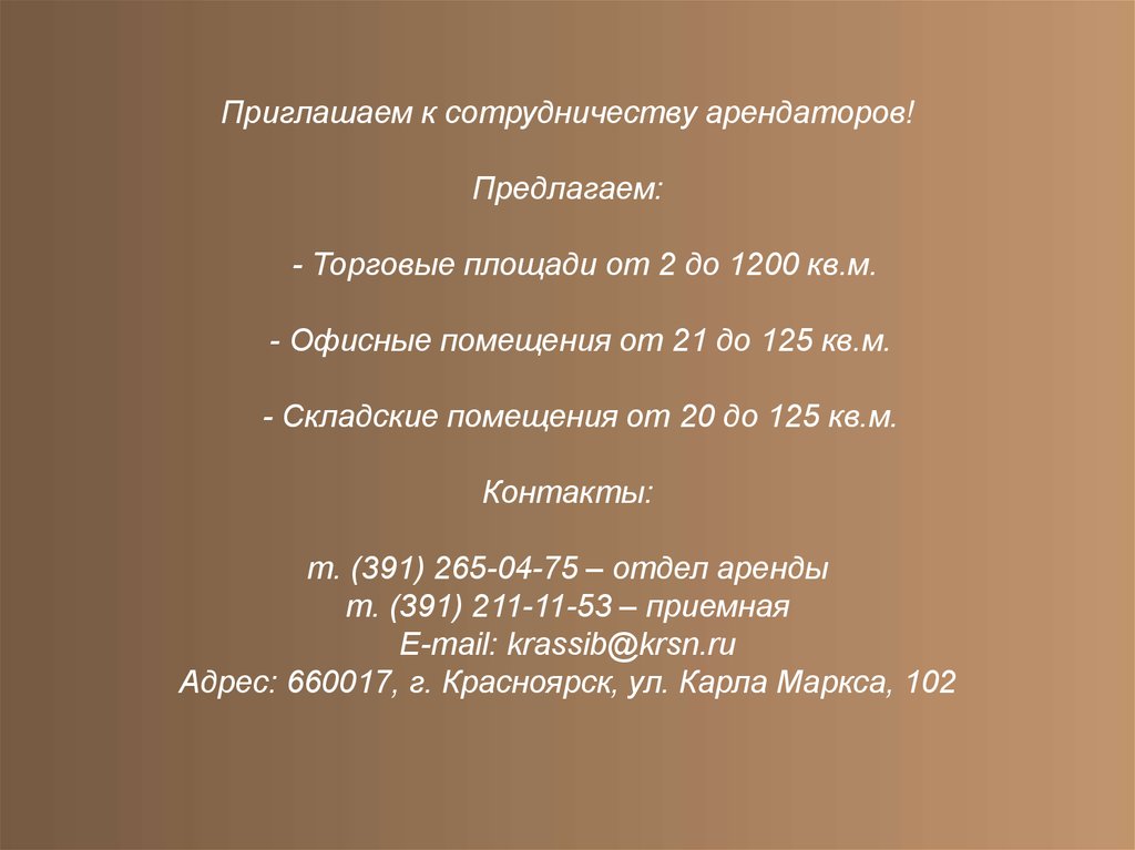 т. (391) 265-04-75 – отдел аренды