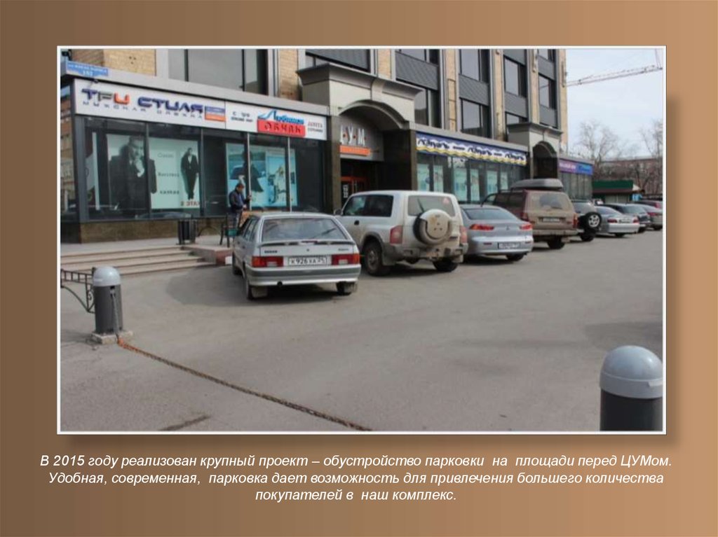 В 2015 году реализован крупный проект – обустройство парковки на площади перед ЦУМом.Удобная, современная, парковка дает возможность для привлечения большего количества
