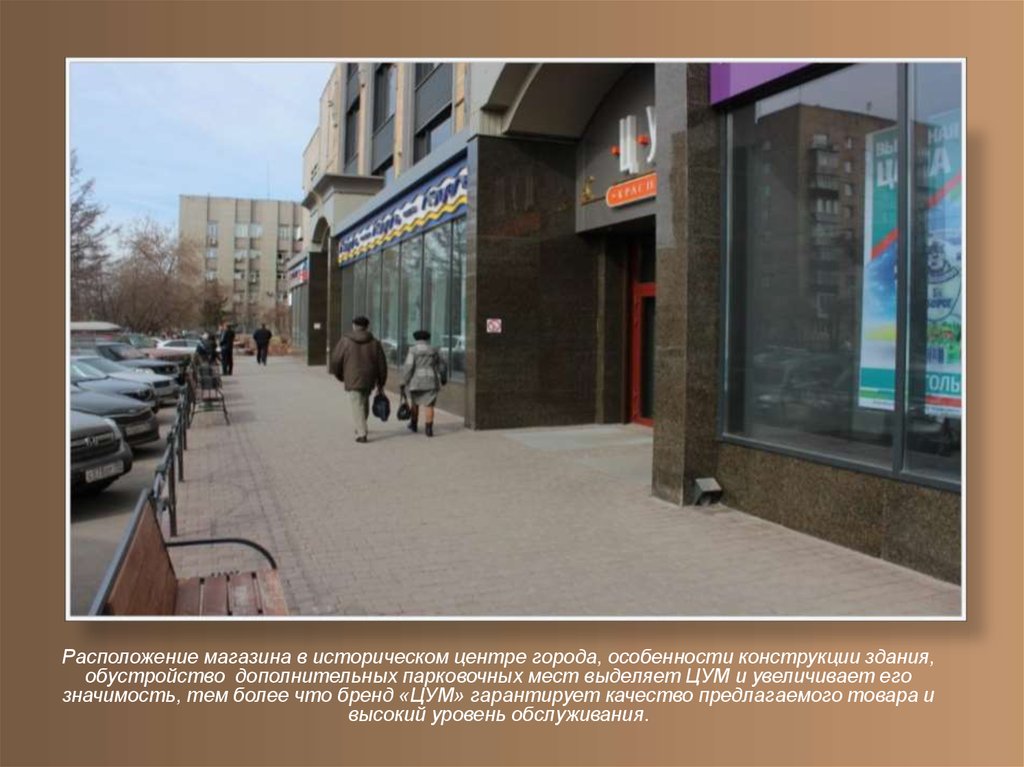 Расположение магазина в историческом центре города, особенности конструкции здания,обустройство дополнительных парковочных мест выделяет ЦУМ и увеличивает его