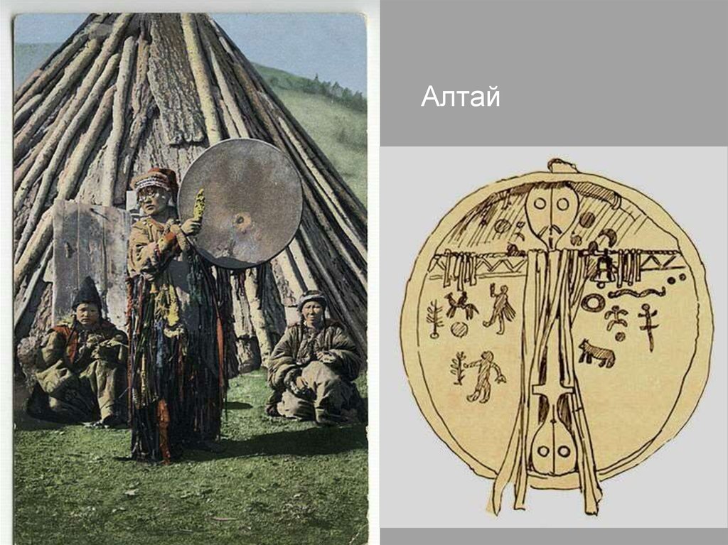 1. Шаман у дерева с изображениями духов-помощников. Эвенки.2. Шаман. Алтайцы. 3. Бубен шамана. Алтайцы. 4.Маска шамана. Эве