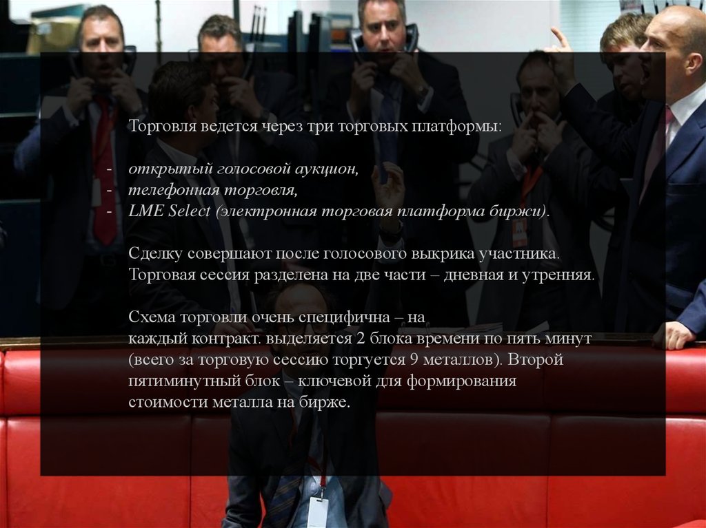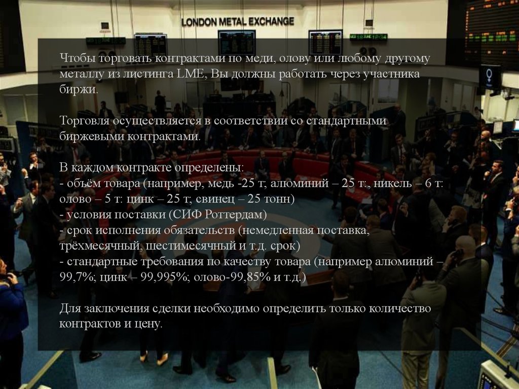 Чтобы торговать контрактами по меди, олову или любому другомуметаллу из листинга LME, Вы должны работать через участника