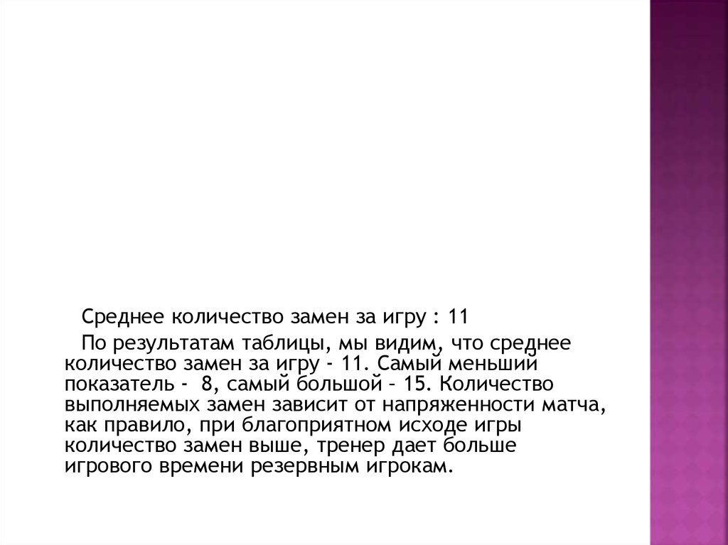 Среднее количество замен за игру : 11По результатам таблицы, мы видим, что среднее